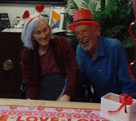 February, 2022. In this picture, we are both laughing a little sarcastic joke by Beverly. The facility had a “kissing booth”’ for Valentine’s Day and worked to take a picture of each couple, happy and loving. I got Beverly in her wheelchair behind a display for the picture. I kneeled on one knee to be at her level for the picture. Others there said, “He is on his knees.” So I turned to her and said, “Will you marry me.” She quickly replied, “OH LORD” very loudly with full dramatic intonation. Everyone in the room laughed, including me. And she really enjoyed this moment.